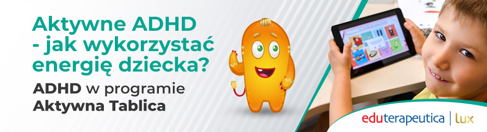 Cechą charakterystyczną dzieci z ADHD jest potrzeba do stymulowania mózgu celem „obudzenia” go. Dlatego warto zainwestować w prawidłowy rozwój swoich podopiecznych, wybierając w programie Aktywna Tablica nową serię pakietów multimedialnych Eduterapeutica Lux ADHD. Eduterapeutica Lux jest adekwatną odpowiedzią na te potrzeby, jak również kompleksowym ujęciem szczebli stymulacyjnych w deficytach rozwojowych wywołanych ADHD. Wypełnij wniosek do 15 maja 2022 roku i wybierz sprawdzone terapie, które dadzą Tobie nowe możliwości prowadzenia zajęć terapeutycznych. Poznaj całą szeroką gamę pakietów multimedialnych i edukacyjnych, które posłużą Tobie to wieloobszarowej w pracy ze SPE.