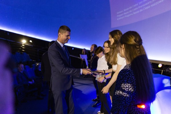 -pięciorga uczniów oraz dwójki nauczycieli – odebrały w Koperniku nagrody z rąk Wiceministra Edukacji i Nauki Dariusza Piontkowskiego oraz Dyrektora Naczelnego Centrum Nauki Kopernik Roberta Firmhofera. Uroczystą galę uświetnił pokaz planetaryjny na żywo prezentujący konstelacje wiosennego nocnego nieba.