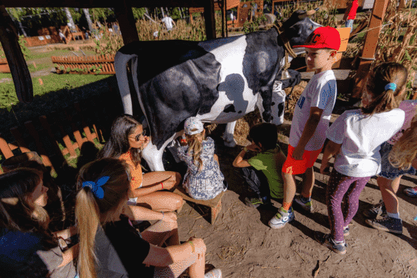 Na początku wycieczki wykorzystujemy największe skupienie dzieci i zabieramy je do fantoma krowy na manualną naukę dojenia. Dla większości z nich jest to tak emocjonujące przeżycie, że zapominają o fakcie, iż krowa nie jest prawdziwa.